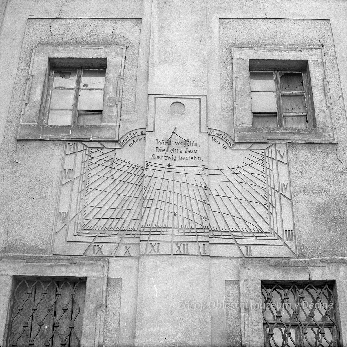 Sluneční hodiny po opravě fasády. Německý nápis v překladu znamená: „Země, slunce, měsíc, hvězdy a všechno, co je, pomine, Ježíšovo učení však přetrvá věčně.“
