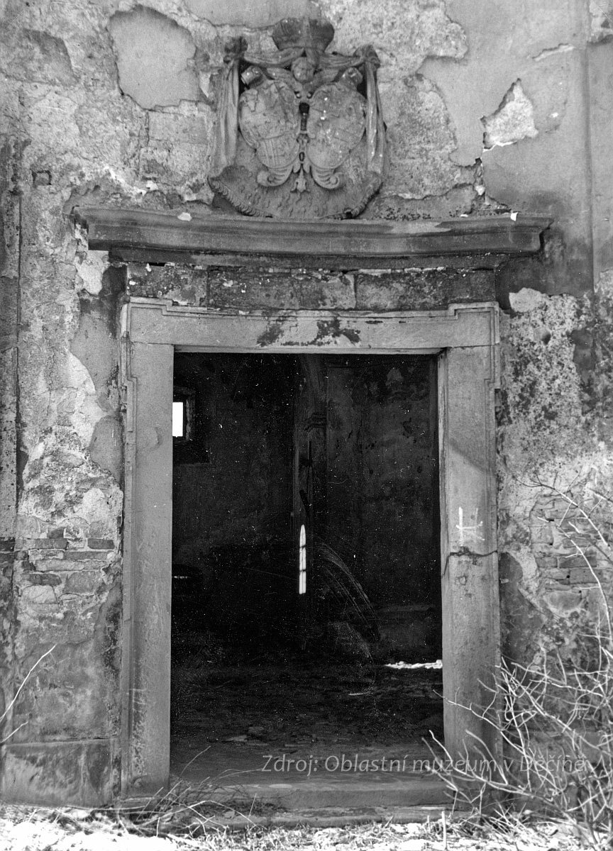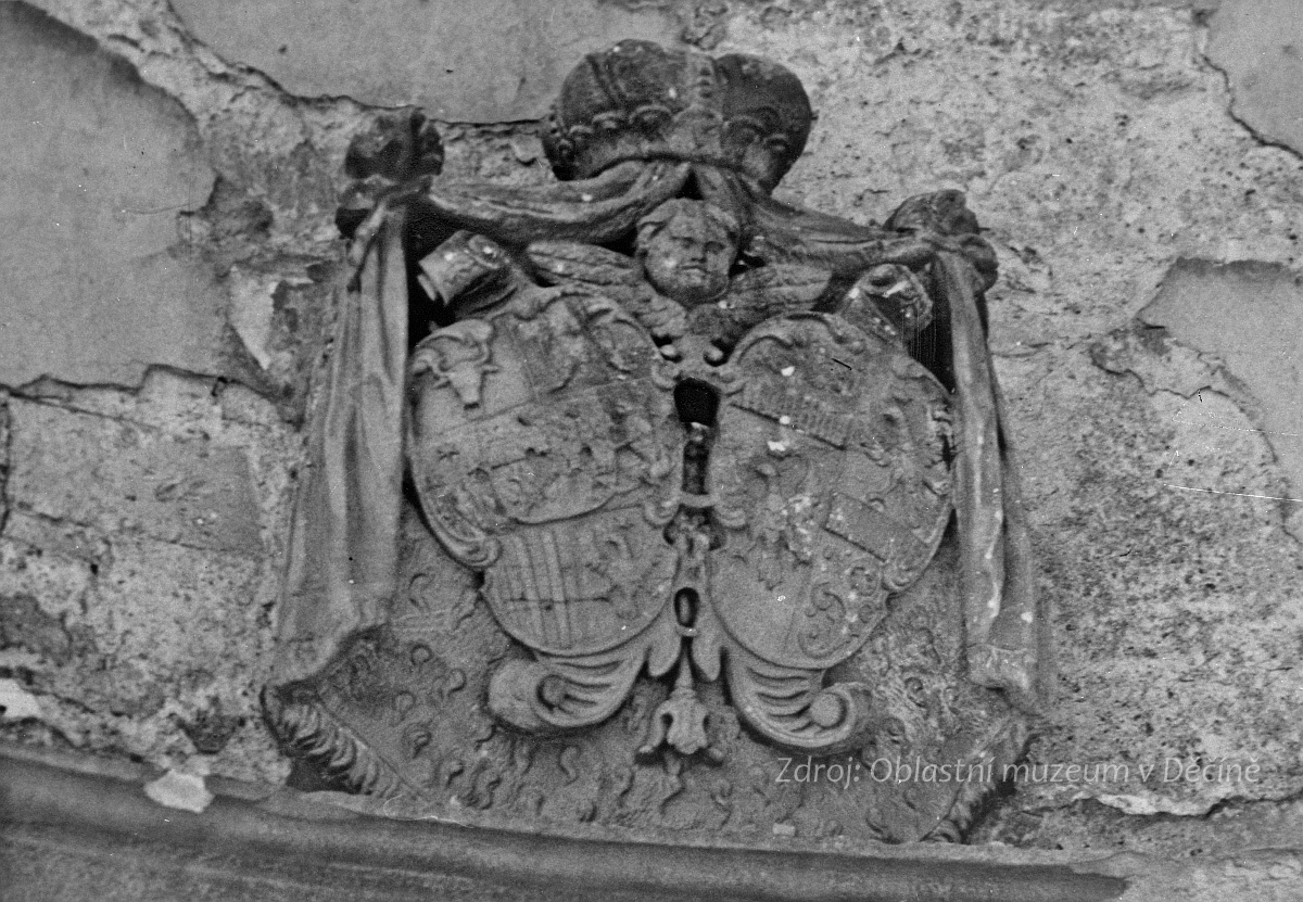 Alianční znak Lobkowiczů se z kostela podařilo zachránit, dnes je v lapidáriu Oblastního muzea v Děčíně