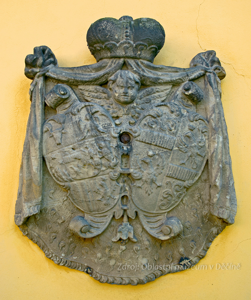 Alianční znak Lobkowiczů v lapidáriu (na nádvoří) Oblastního muzea v Děčíně