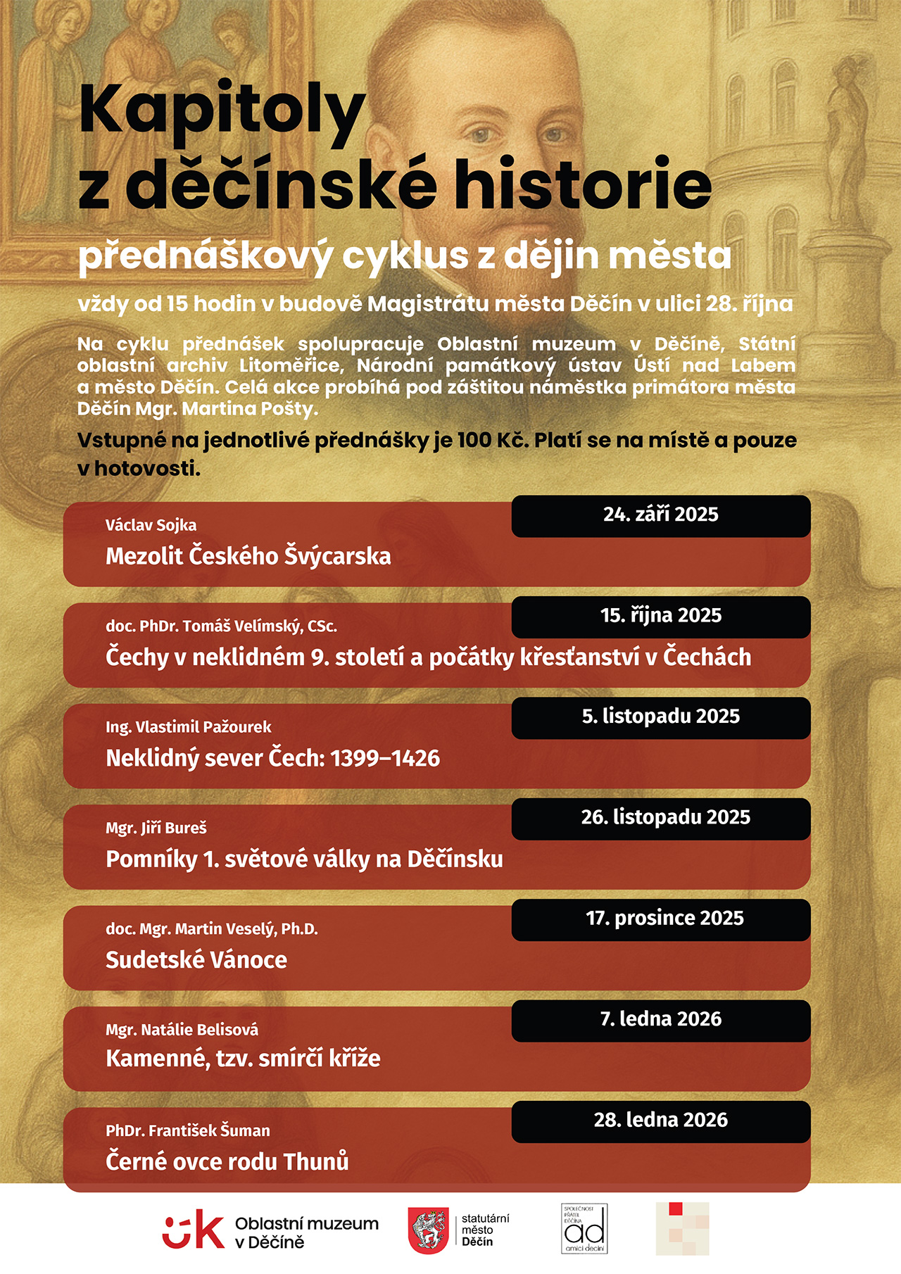 2. ročník přednáškového cyklu Kapitoly z děčínské historie ssir čt 18. 09. 2025 - 08:20 přílohy Kapitoly z děčínské historie – 2. ročník, část A (pdf) Plán přednášek do 28. ledna 2026 vidíte v přehledu níž, navazující přednášky budou zveřejněny později.