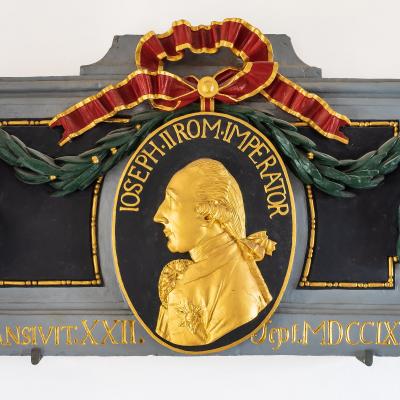 Každého návštěvníka našeho muzea již ve vstupní hale zaujme kamenná polychromovaná deska se zlaceným medailonem. Je jednou z cenných památek, které se muzeu podařilo zachránit během demolice historického centra Děčína. Připomíná slavný okamžik v dějinách města - návštěvu císaře Josefa II. dne 22. září 1779. Panovník chtěl tehdy v našem regionu osobně posoudit obranyschopnost habsburské monarchie. Tři pruské vpády v několika desetiletích (během války o rakouské dědictví, sedmileté války a tzv. „bramborové války“) jasně ukázaly zranitelnost její severní hranice.